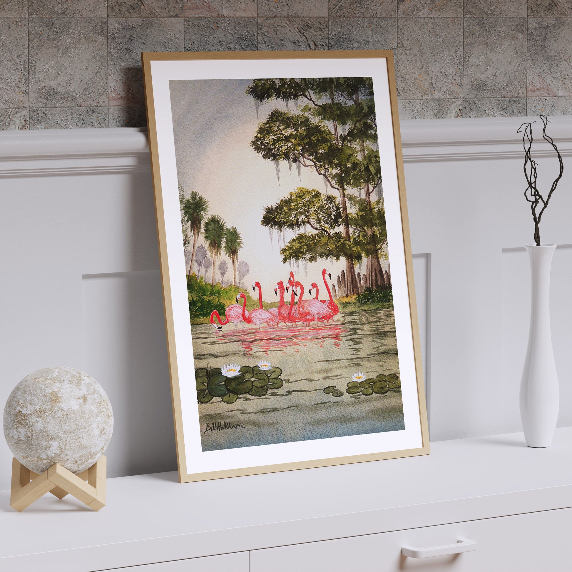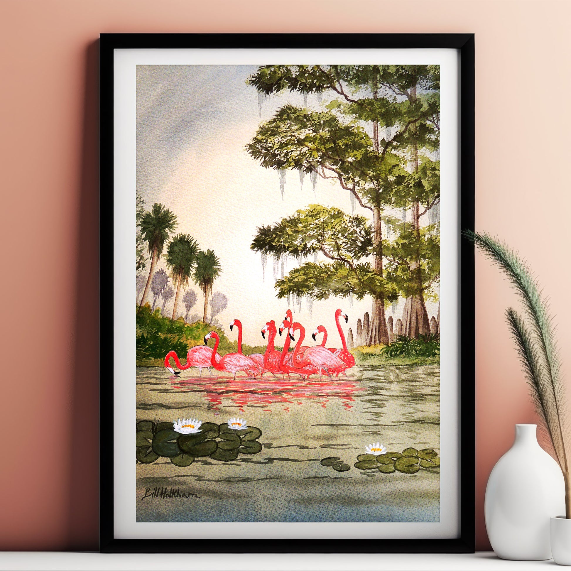 A Flamboyance Of Flamingos In Florida Watercolor Art Print from the Original by Bill Holkham. All our prints are produced using Museum-Quality (200 gsm/80 lbs) Matt Paper. Prints are provided unframed.