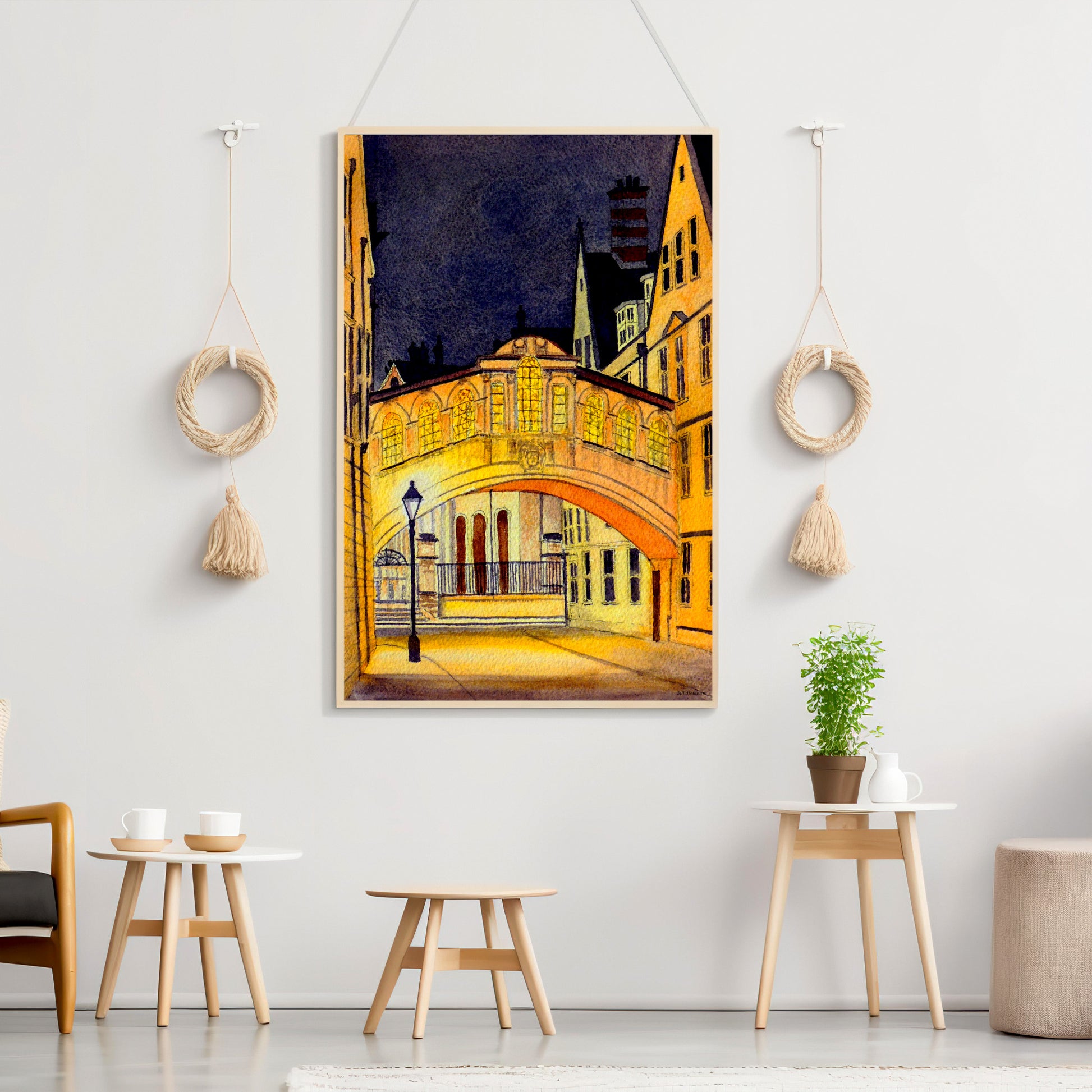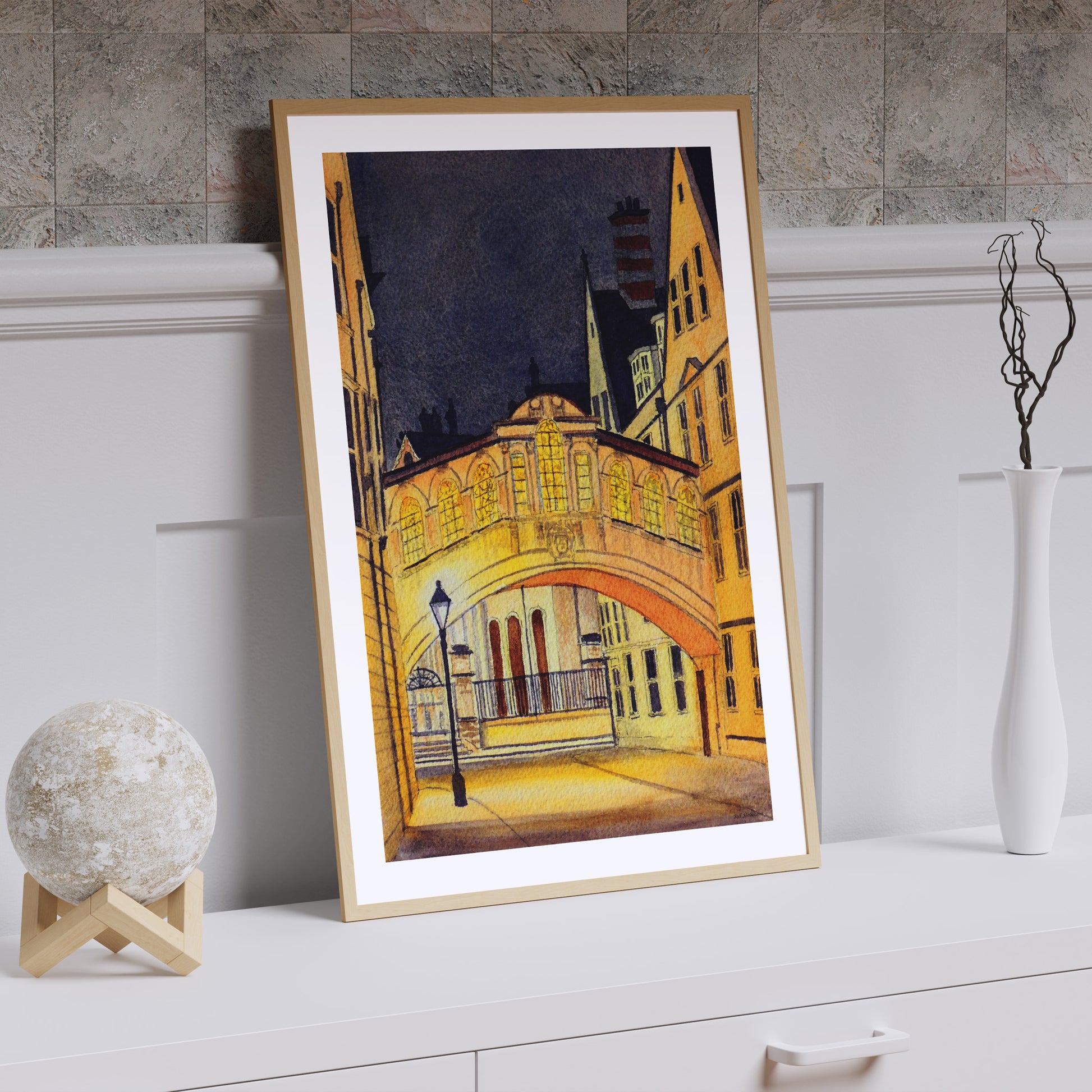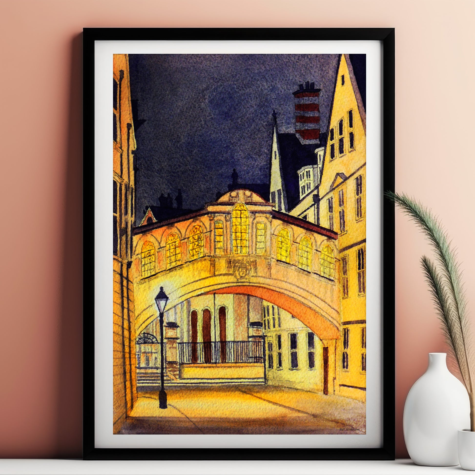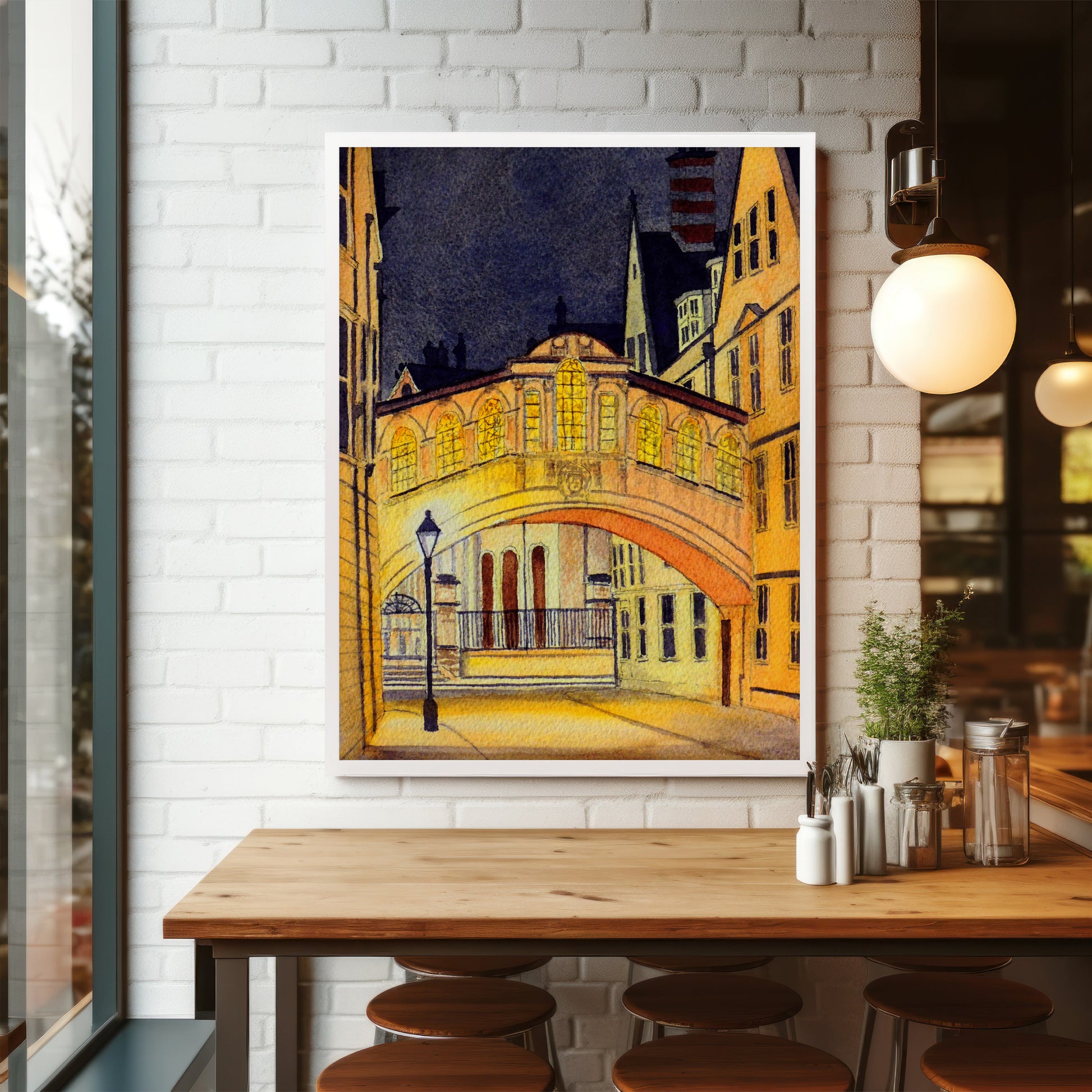 Oxford at night trades its scholarly hush for something deeper—shadows, echoes, and the glow of the Bridge of Sighs lit like a scene from a forgotten novel. I painted this watercolor to capture that stillness, where warm light spills onto empty streets and history feels alive under the stars. For lovers of nocturnal cityscapes, historic England, and architecture with soul, this art print brings Oxford’s after-hours magic to your wall—moody, timeless, and unmistakably real.