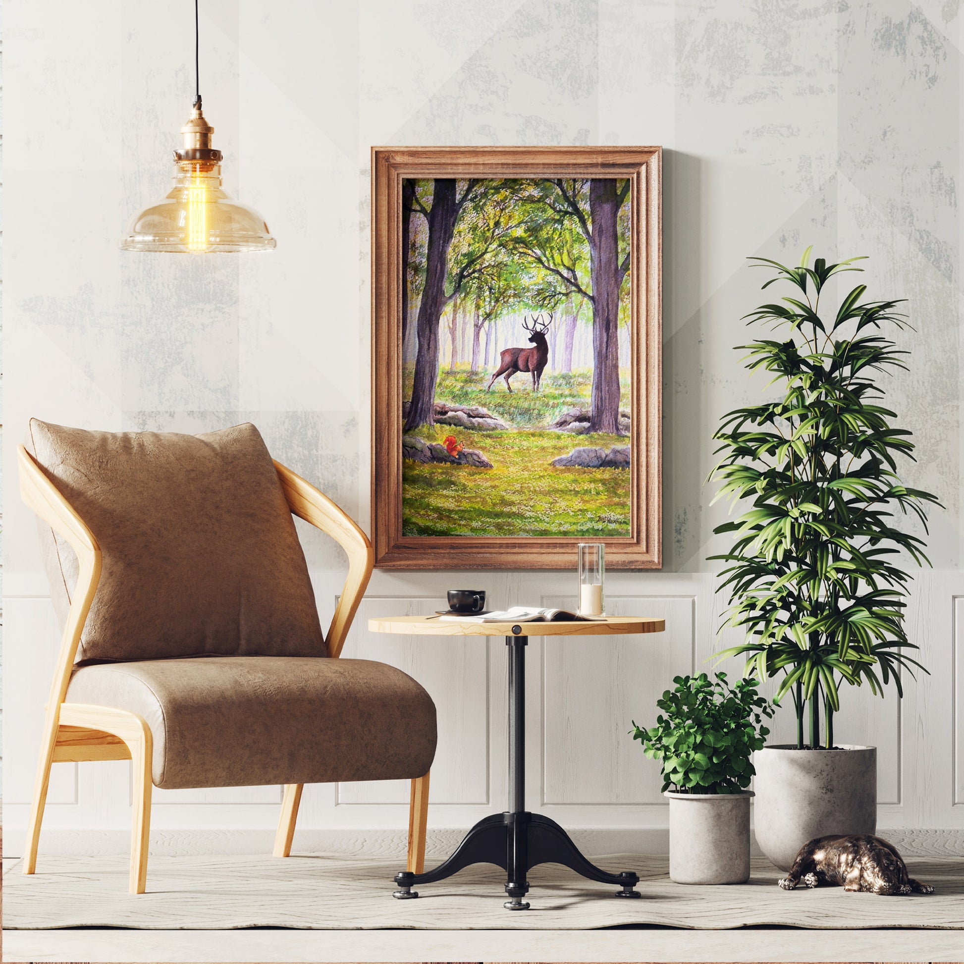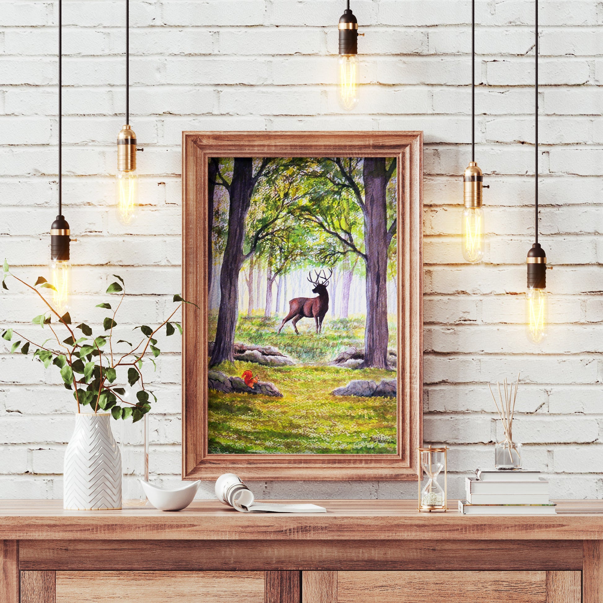 A deer emerges from the mist in a quiet woodland, while a red squirrel munches on acorns, lost in its own world. The painting captures the contrast of light and shadow, with a soft mist hanging in the air and the first signs of fall—leaves scattered on the ground, a reminder that change is on the way. This watercolor art print brings the serene, yet dynamic beauty of the woods to life, where the subtle shifts of light, dark, and season create a moment worth pausing for.
