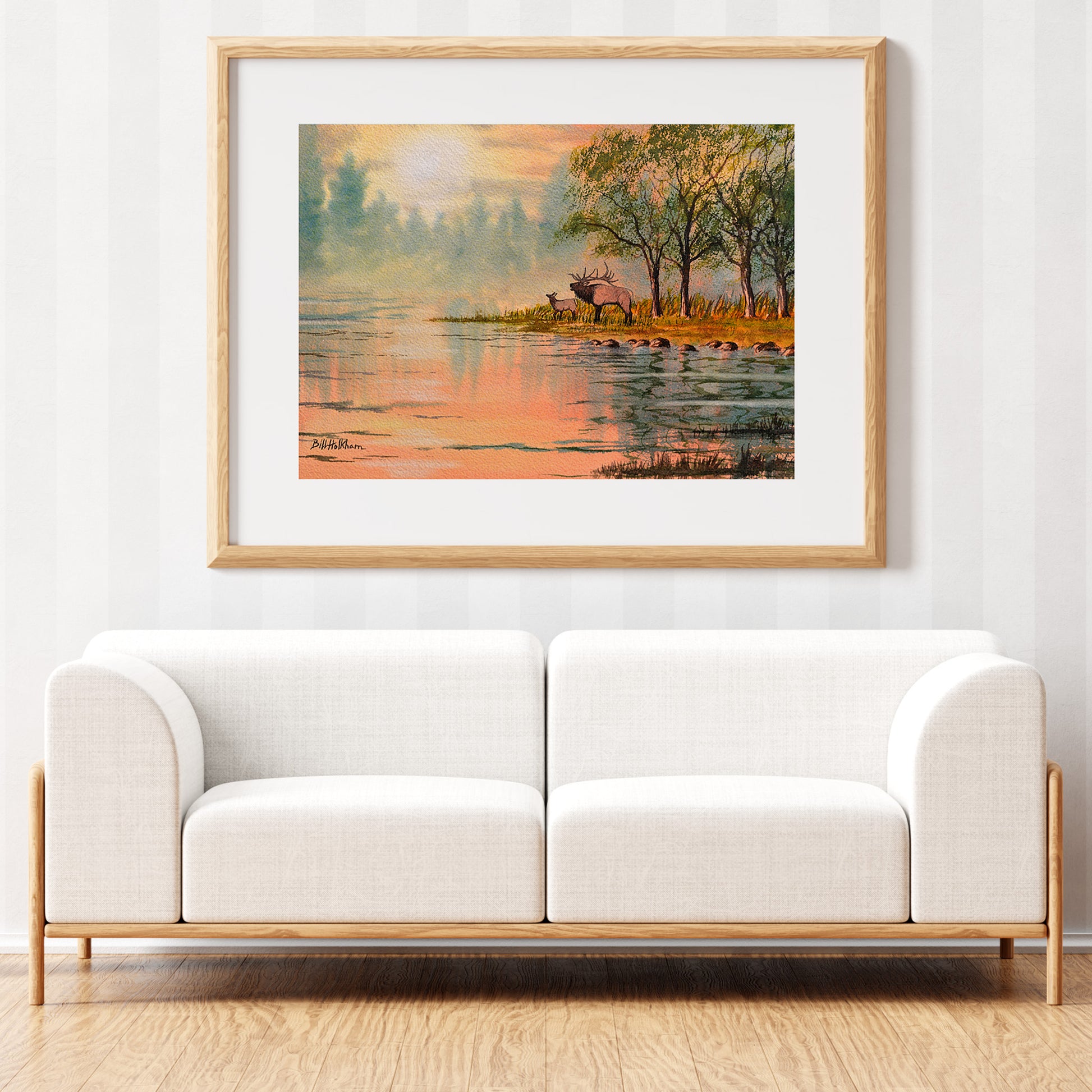 Elk Beside A Misty River Watercolor Art Print from the Original by Bill Holkham. All our prints are produced using Museum-Quality (200 gsm/80 lbs) Matt Paper. Prints are provided unframed.