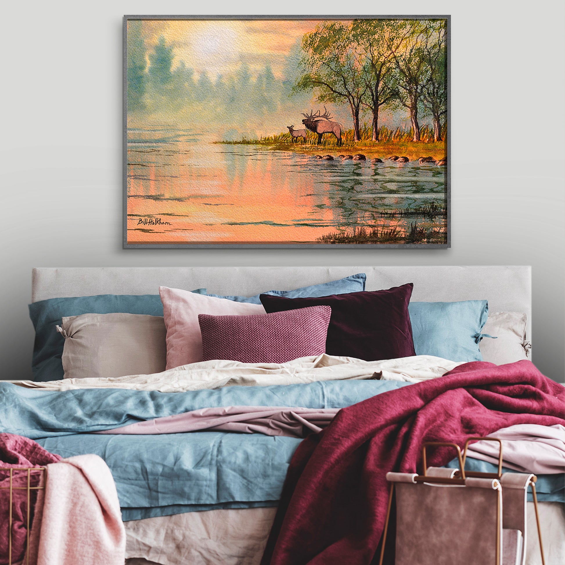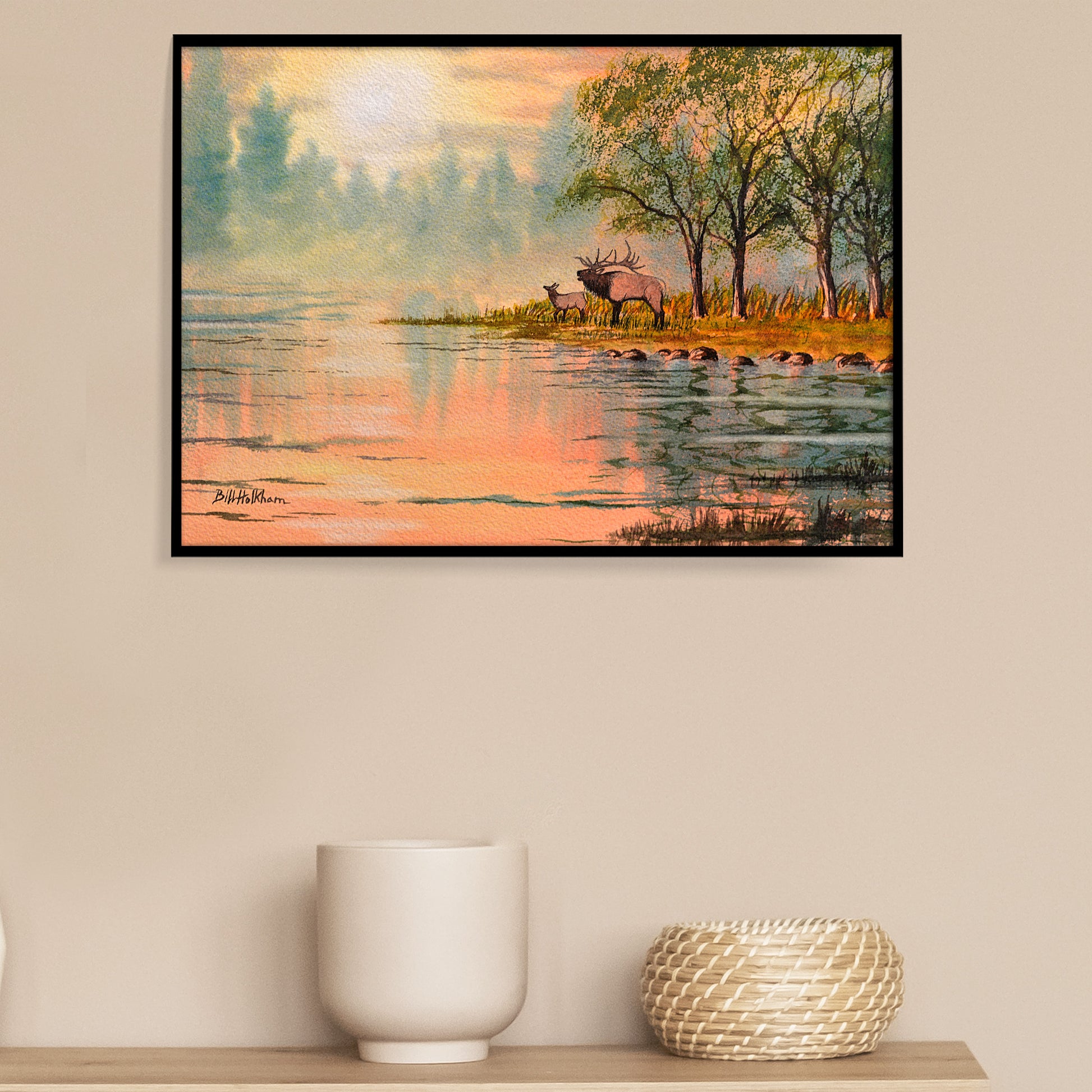 There’s something about a misty river at sunrise—everything slows down, the world’s still waking up. Elk stand at the water’s edge, their silhouettes softened by the fog. This watercolor art print captures that moment when nature whispers, and the quiet beauty of the morning fills your soul. It’s the kind of scene that invites you to breathe deeply and just be—perfect for those who appreciate the serene, unhurried pace of the wild.