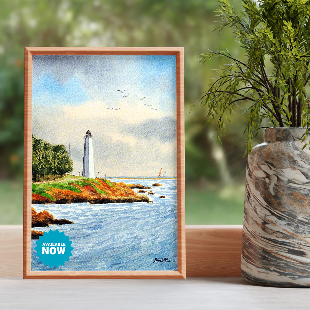 Five Mile Point Lighthouse Watercolor Print from the Original by Bill Holkham. All our prints are produced using Museum-Quality (200 gsm/80 lbs) Matt Paper. Prints are provided unframed.