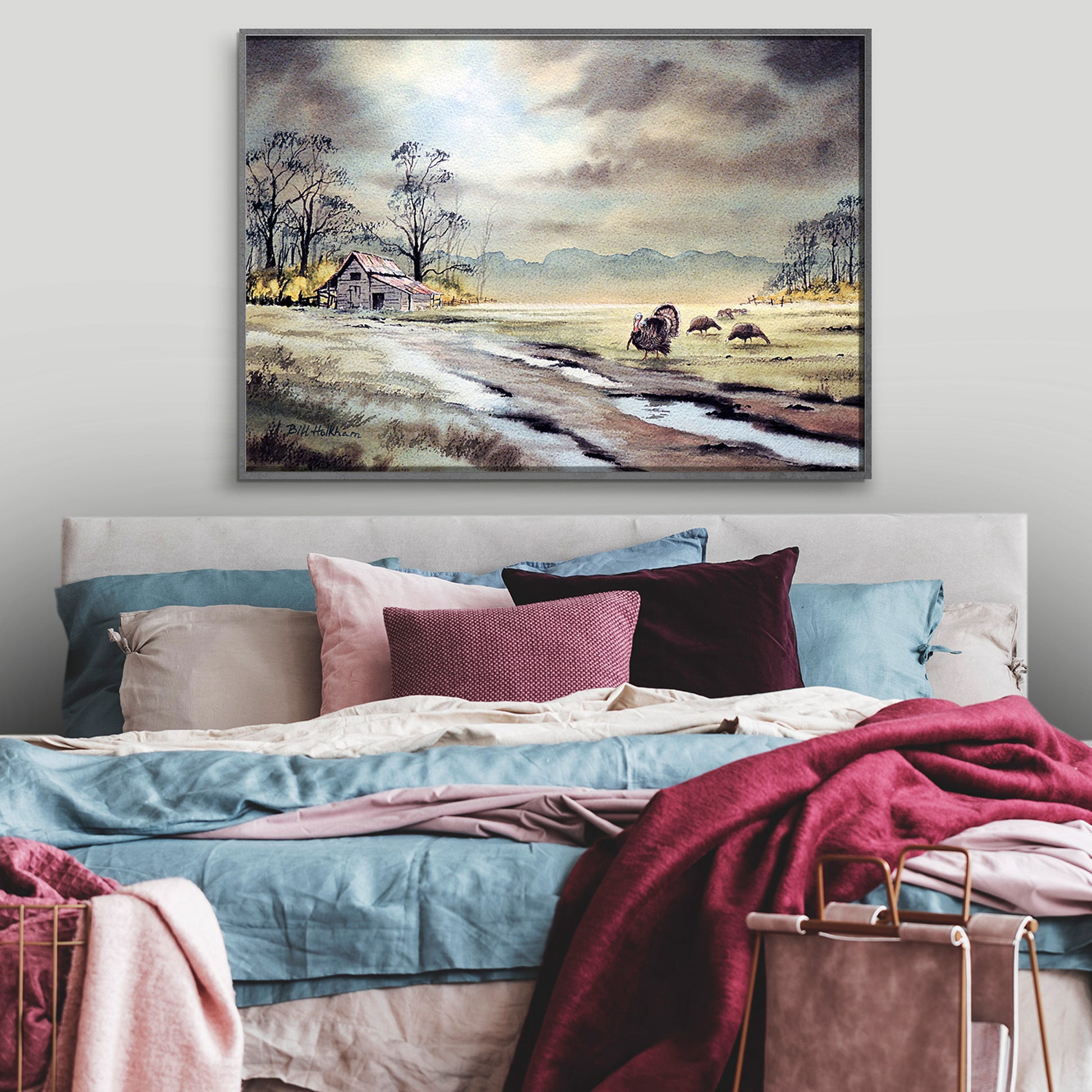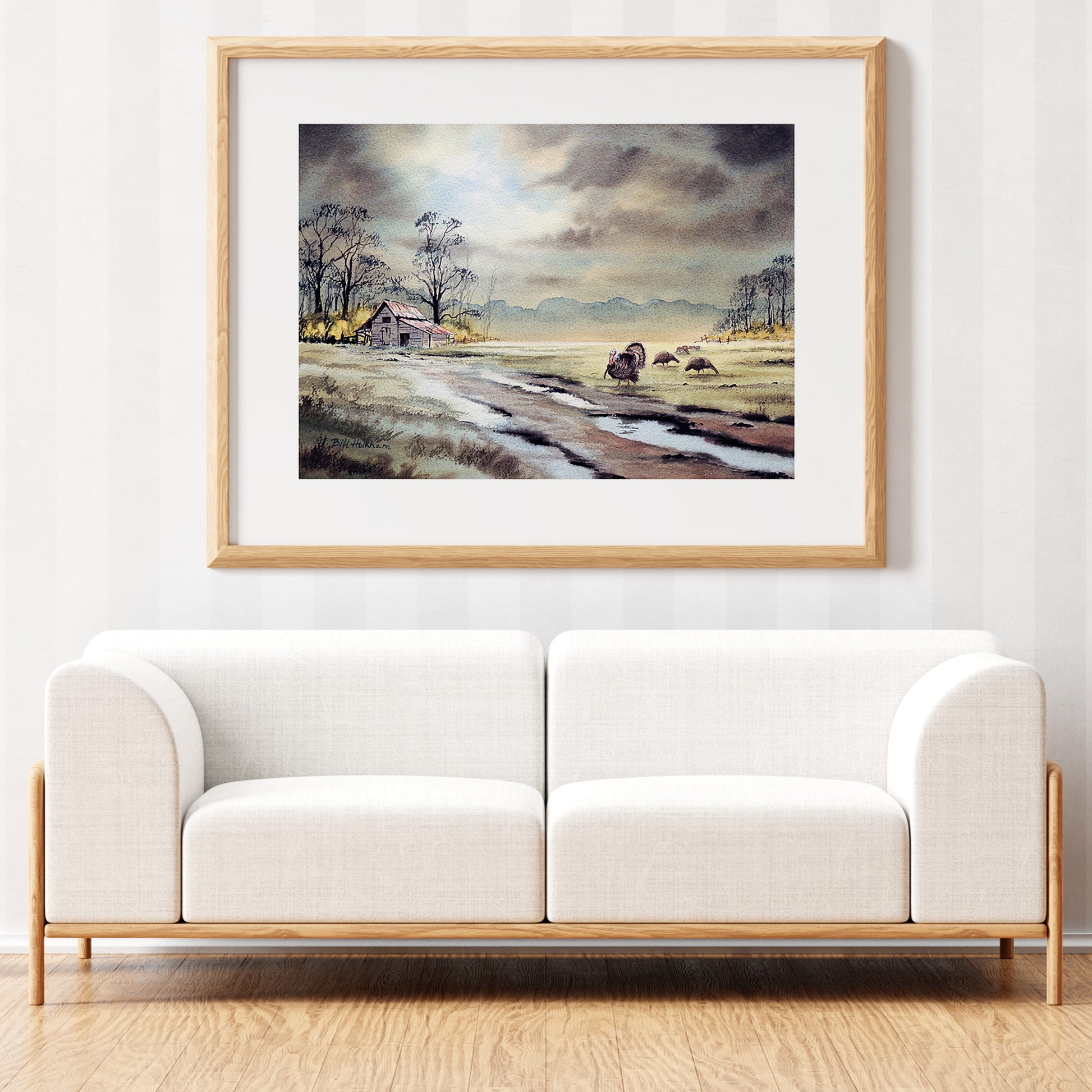 The sun breaks through the clouds on a misty morning, casting sharp light on the turkeys grazing in the grass, their figures stark against the fog. The water in the tracks leading to the farm reflects the light, guiding your eye deeper into the scene. This watercolor art print captures the raw beauty of that quiet moment—nature in all its glory, where the world feels still but everything’s alive, waiting to be noticed.