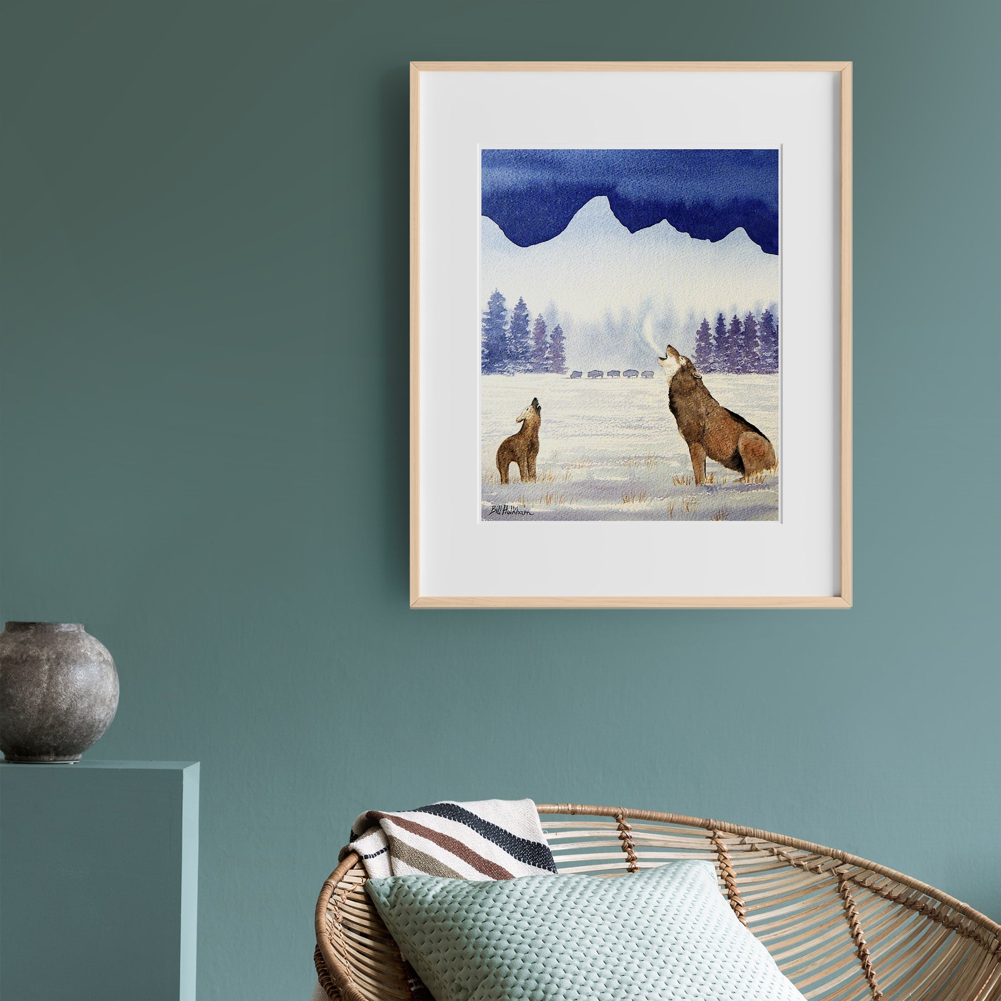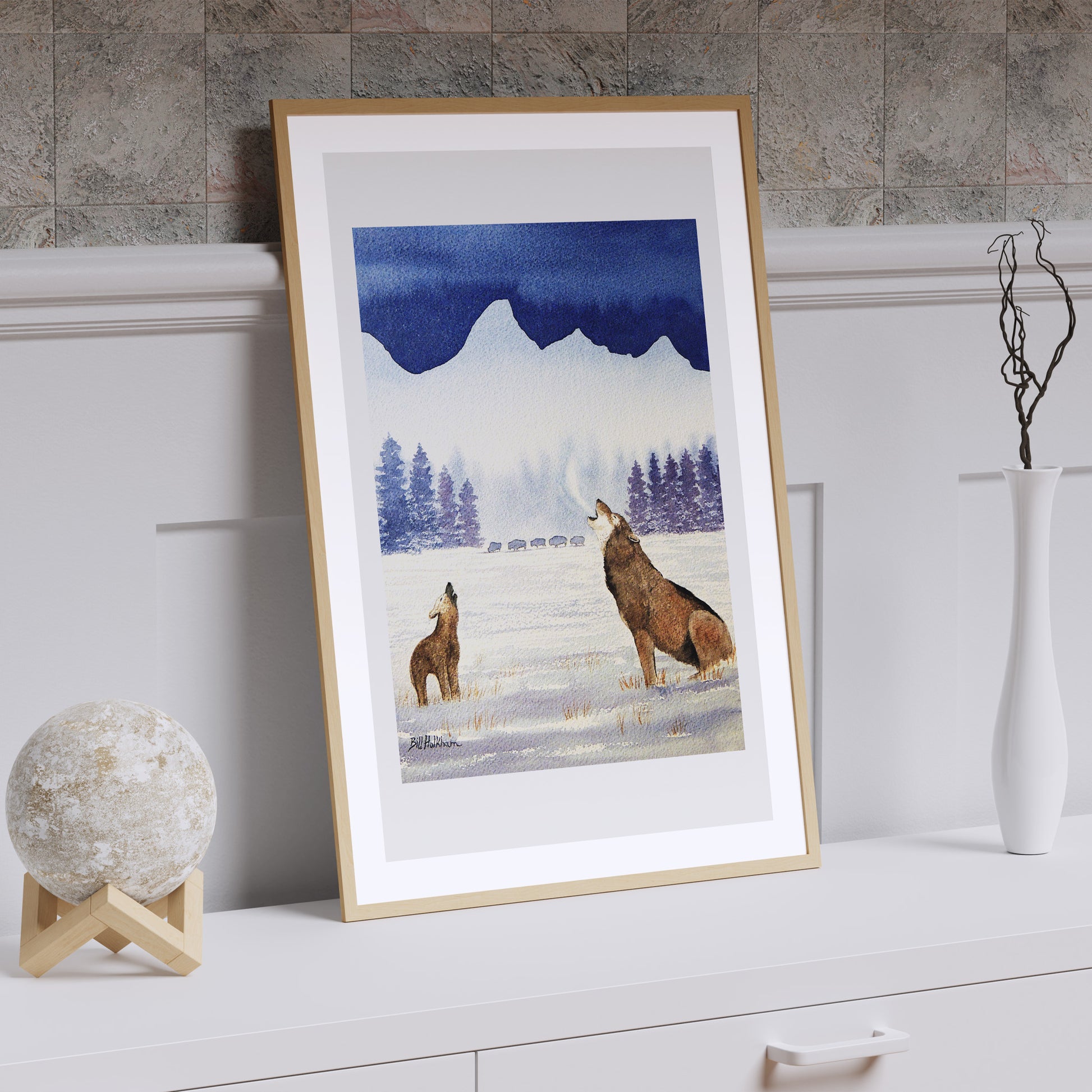 Howling Wolves Grand Teton National Park Watercolor Art Print from the Original by Bill Holkham. All our prints are produced using Museum-Quality (200 gsm/80 lbs) Matt Paper. Prints are provided unframed.