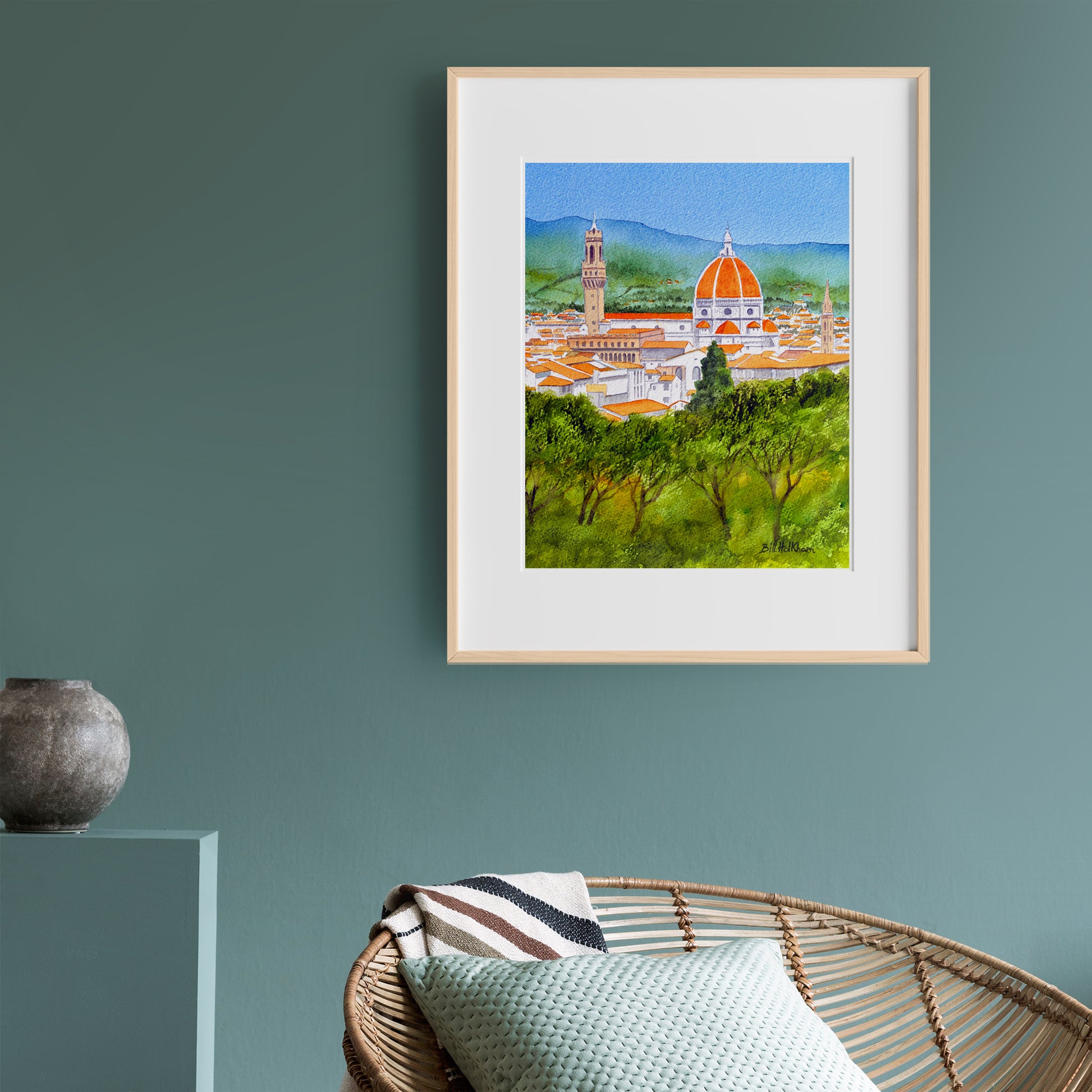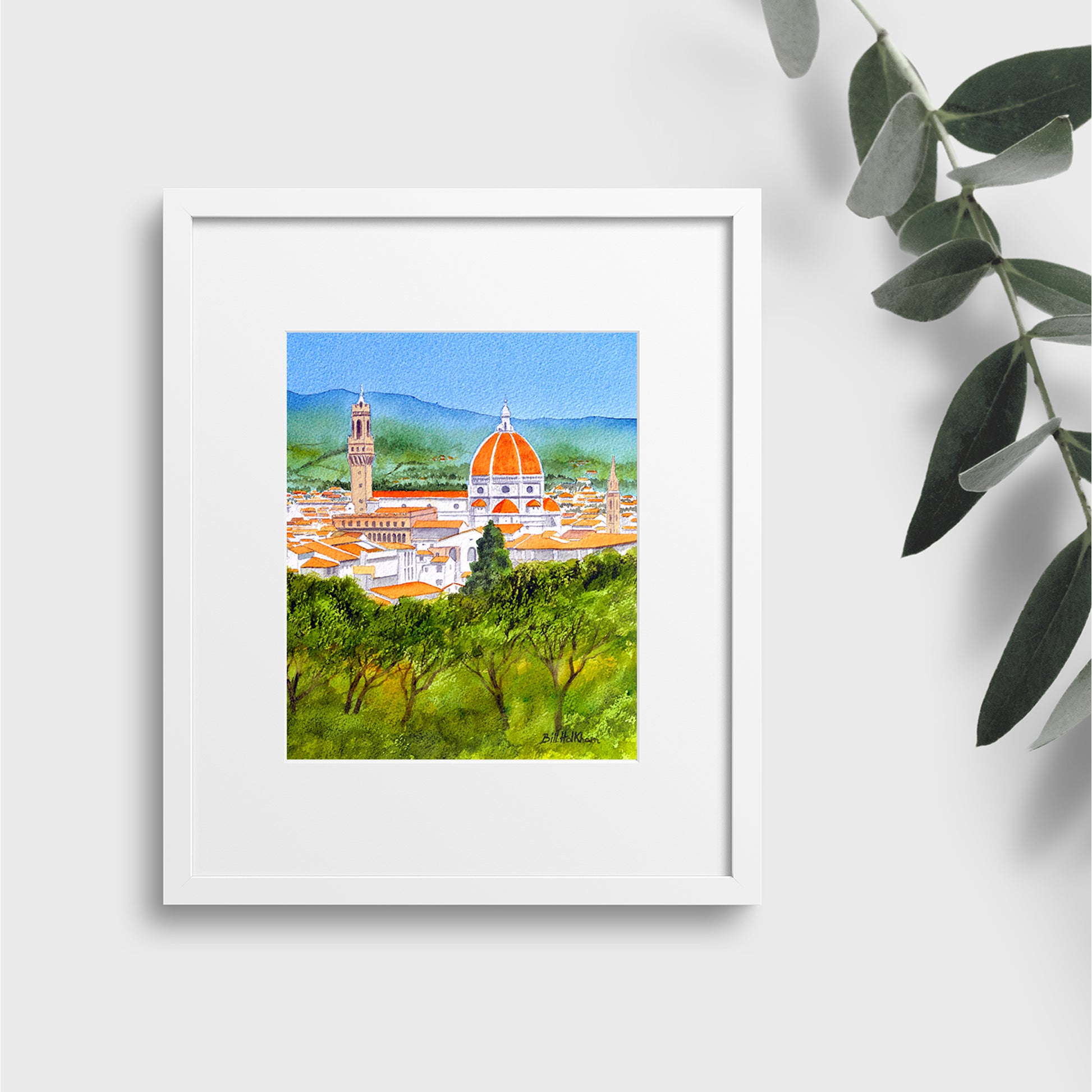 I painted this after a visit to Florence, inspired by the breathtaking views from the top of Il Duomo. From up there, the city unfolds in every direction, with the iconic Palazzo Vecchio standing proudly nearby. This watercolor captures the timeless beauty of Florence—its warm rooftops, historic landmarks, and that unforgettable Tuscan light.