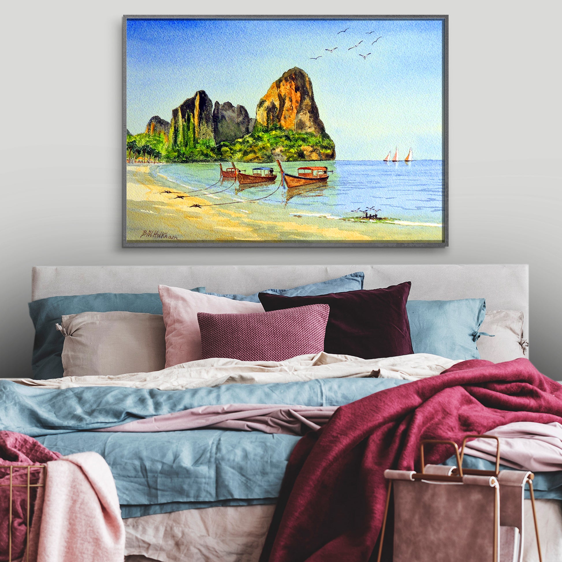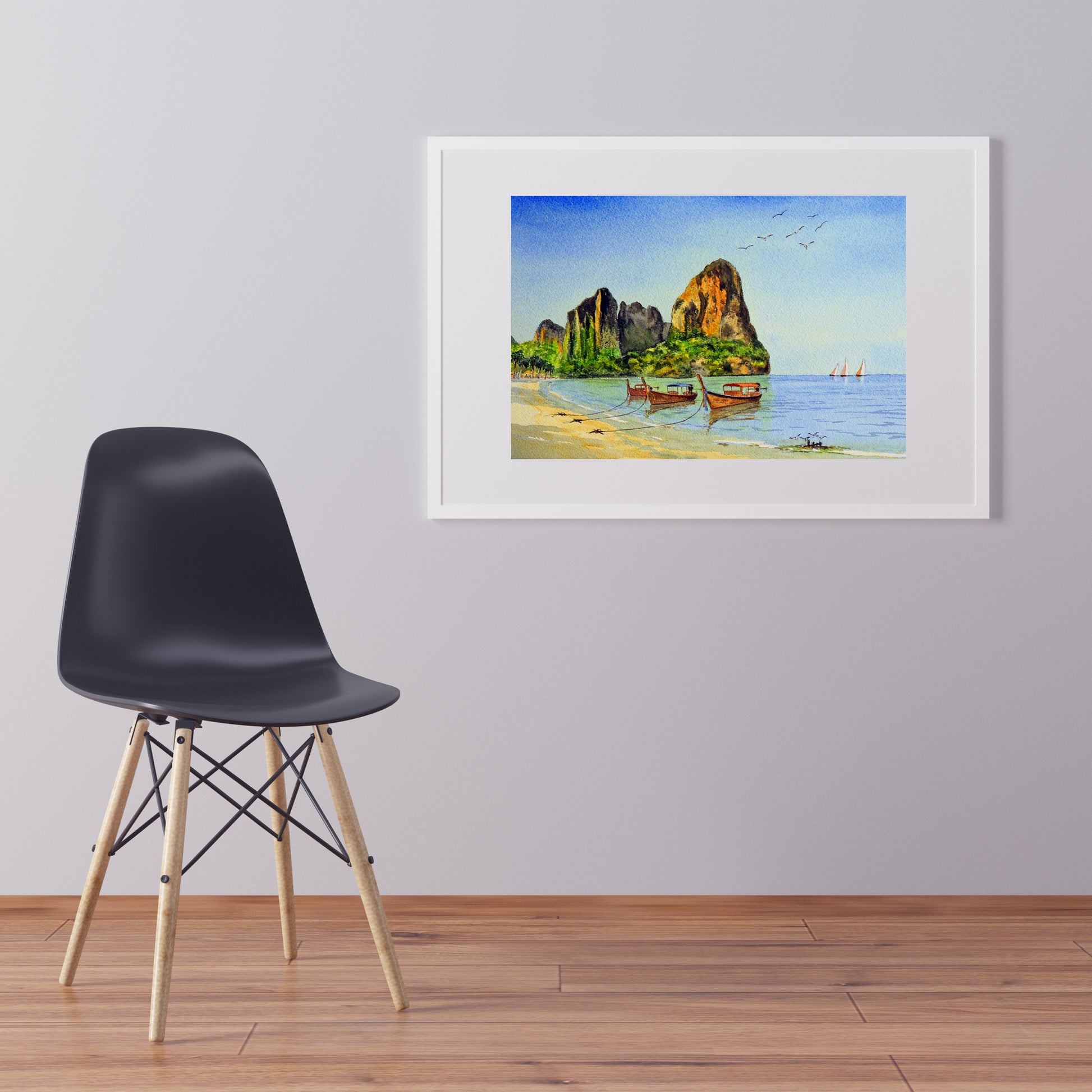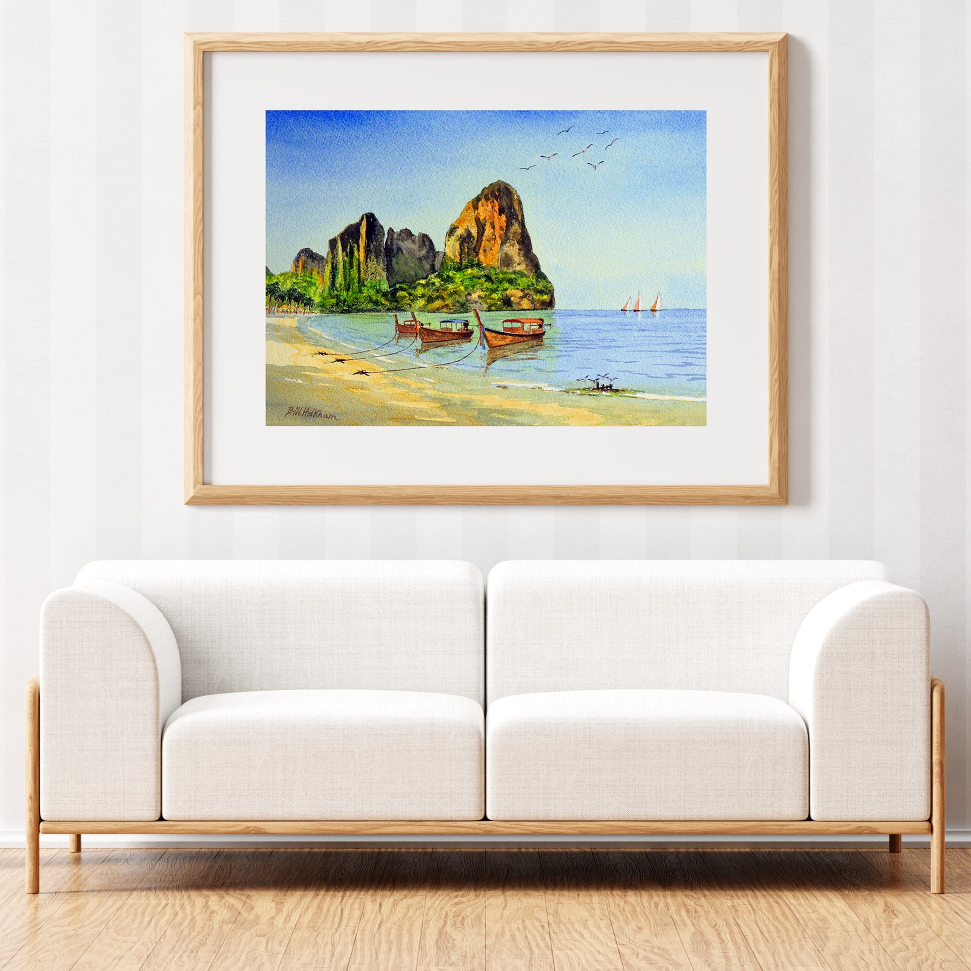 I painted this iconic view of Railay Beach, where the sun casts a golden glow over the limestone cliffs, and the long-tail boats sit, ready for another day of adventure. It’s the kind of scene you’ve seen a thousand times on postcards, but standing there, it still takes your breath away. This watercolor art print captures the essence of Railay, a small peninsula between Krabi and Ao Nang in Thailand, where every corner feels like a perfect moment waiting to be lived.