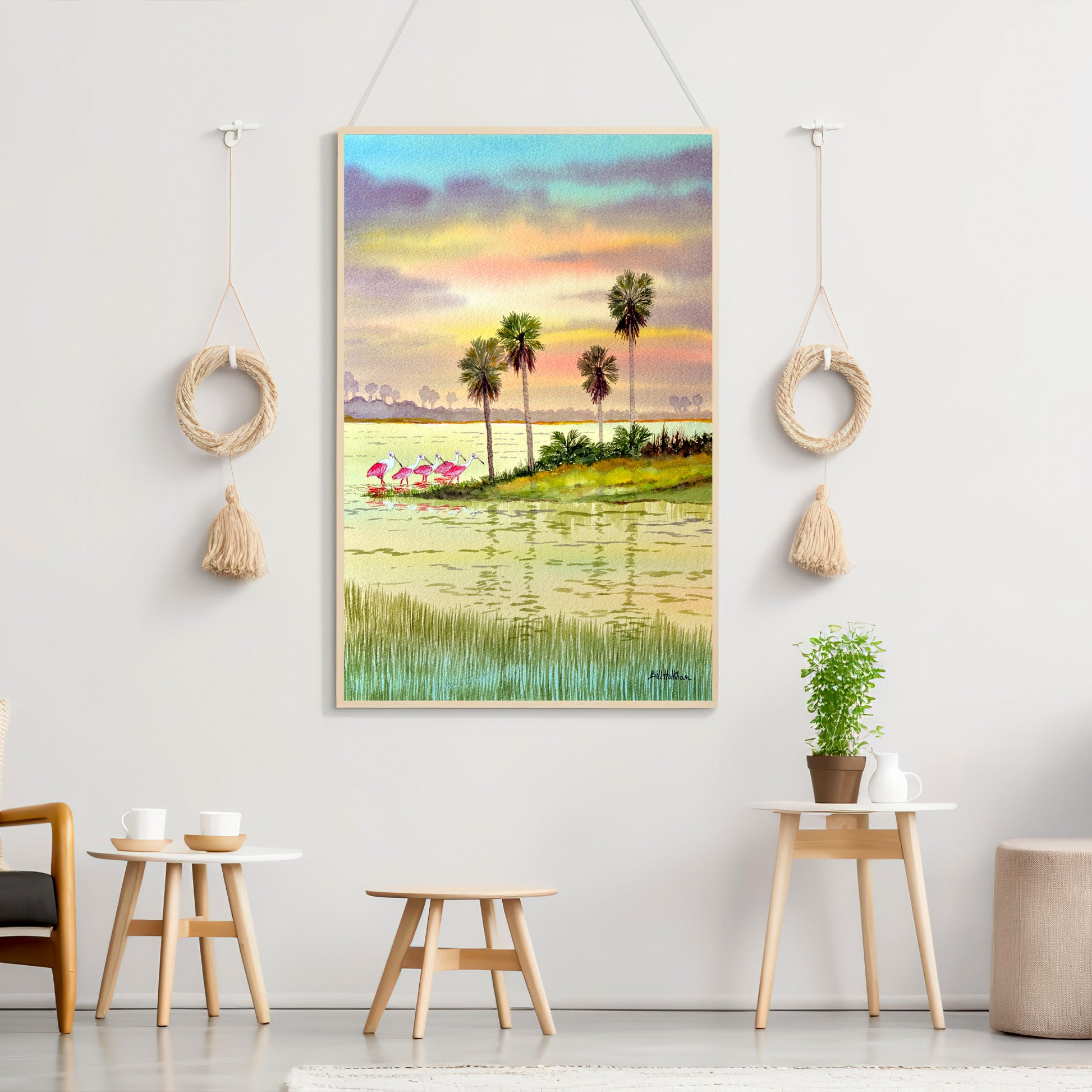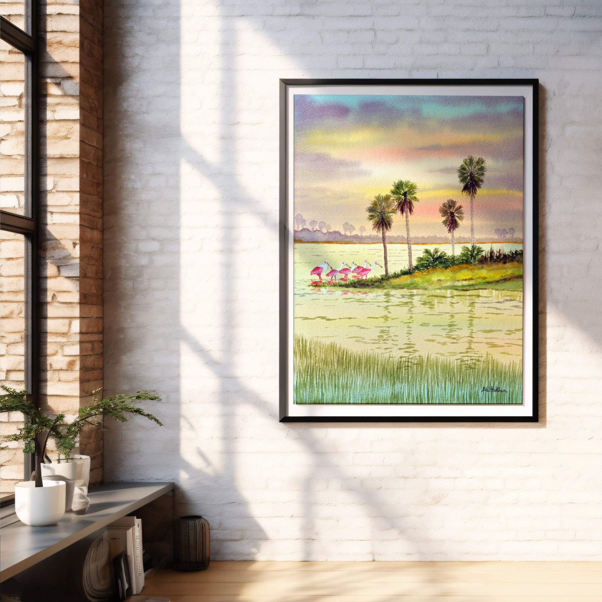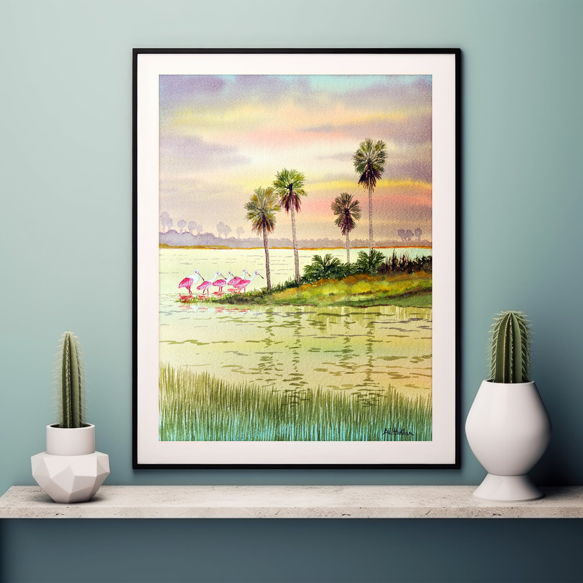 Roseate Spoonbills forage through the shallows of Stoney Bayou, their vibrant pink feathers glowing under the colors of a St. Marks National Wildlife Refuge sunrise. The air is thick with the smell of saltwater and the quiet hum of early morning, when everything feels possible. This watercolor art print captures that moment—where color, light, and wildlife come together in a perfect rush of life. It’s the kind of scene that lingers, a reminder of nature’s stunning simplicity.