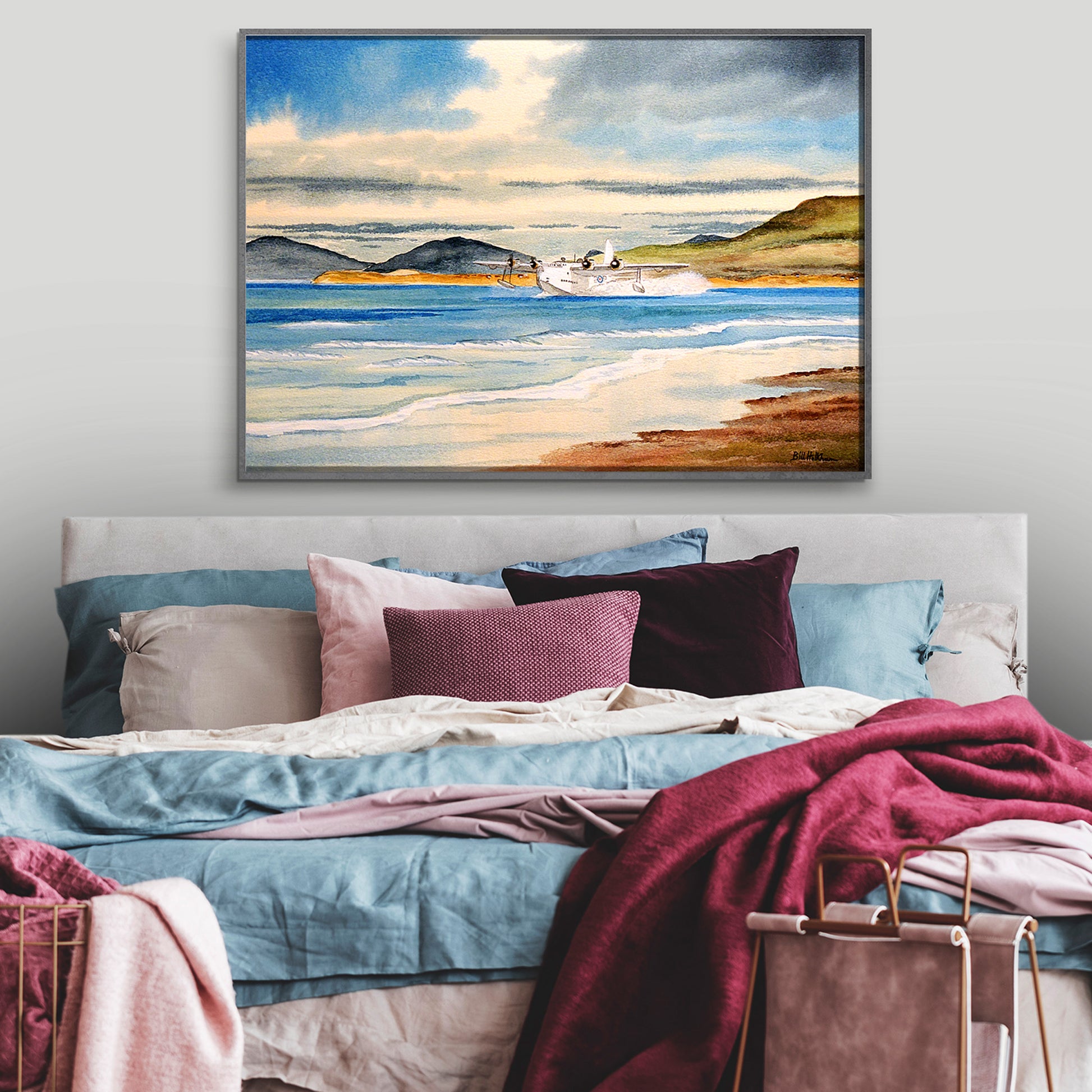 A Sunderland takes off from a Scottish loch, its engines roaring like a beast that refuses to be tamed. Built by the Short Brothers, this flying boat patrol bomber was no ordinary machine—it hunted U-boats in the battle of the Atlantic, earning the nickname "Flying Porcupine" for its defensive power. This watercolor art print captures that raw power and history, a tribute to a flying legend that soared through danger with 1010 horsepower and the heart of a warrior.