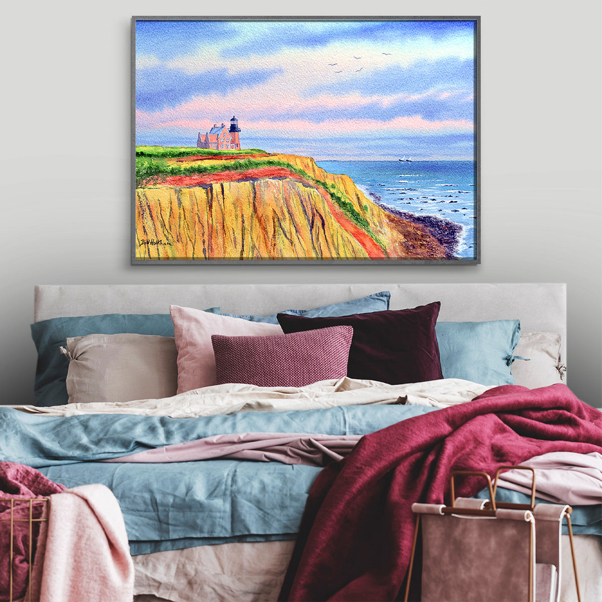 I painted Block Island's Southeast Lighthouse to show it the way it deserves to be seen—perched high on the Mohegan Bluffs, calm, proud, and bathed in evening light. The colors of the bluffs rise into the sky, mirrored in soft watercolor tones that give the whole scene a quiet, reflective beauty. This lighthouse on the southeastern edge of Block Island, Rhode Island, isn’t just a landmark—it’s a moment of peace carved out of wind, stone, and sea.