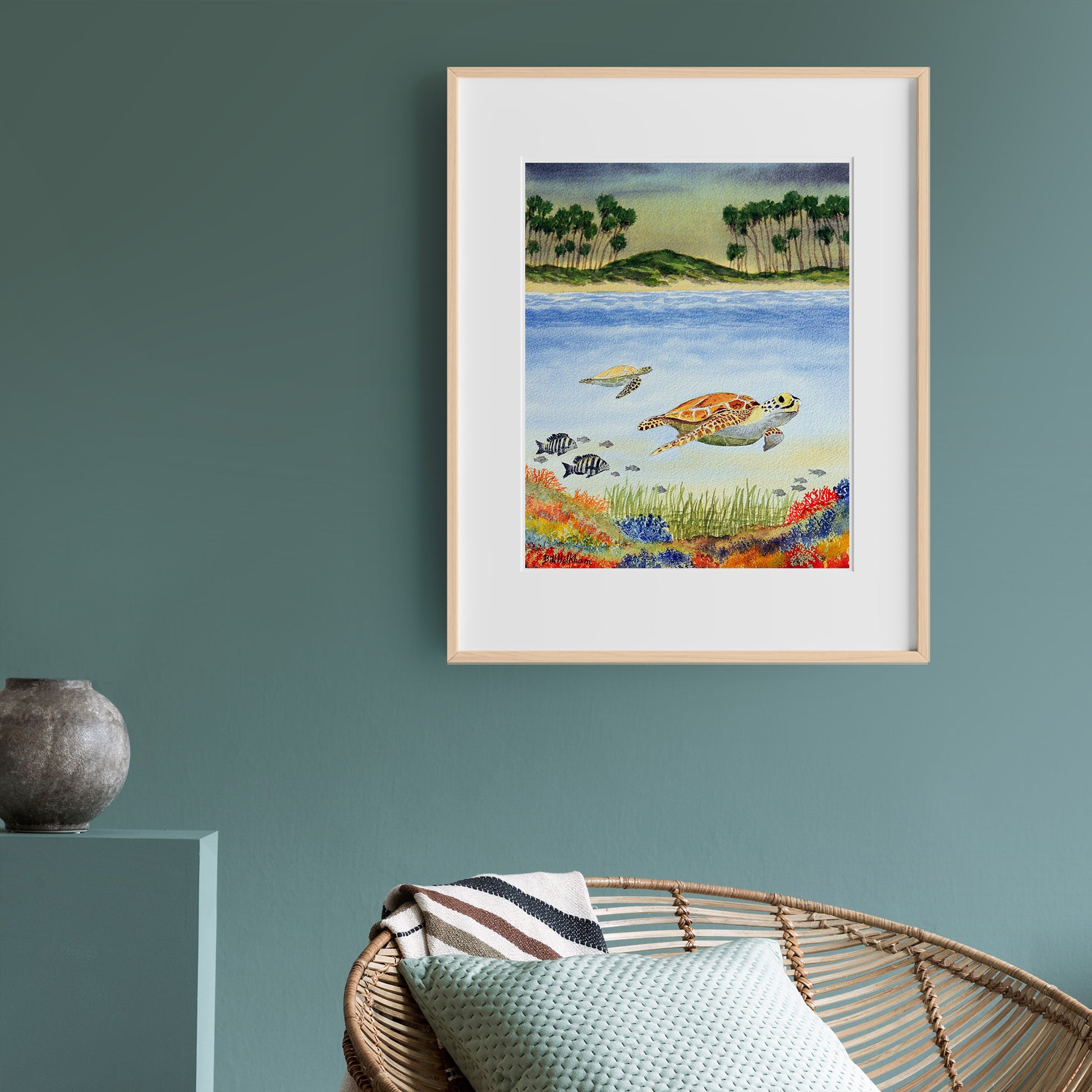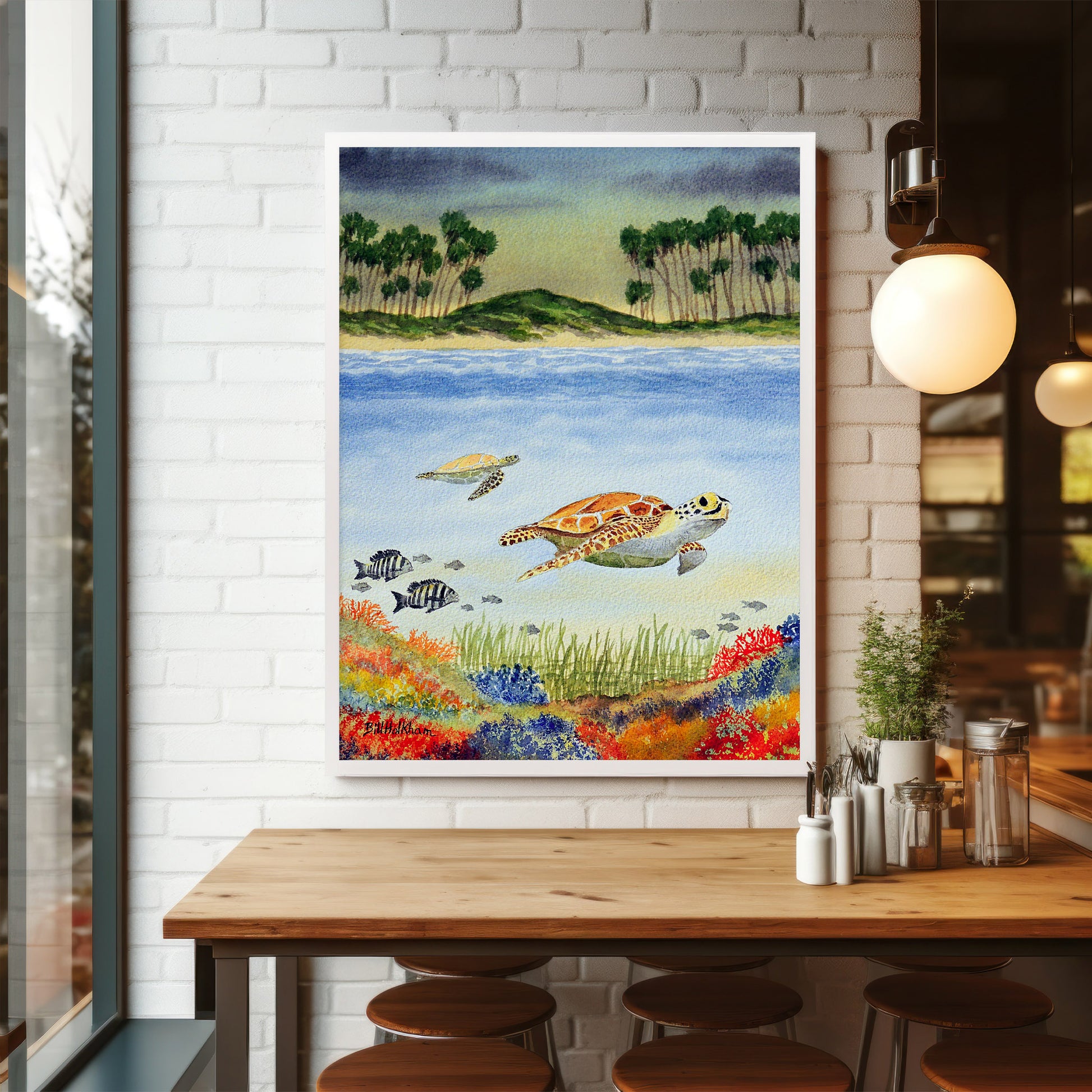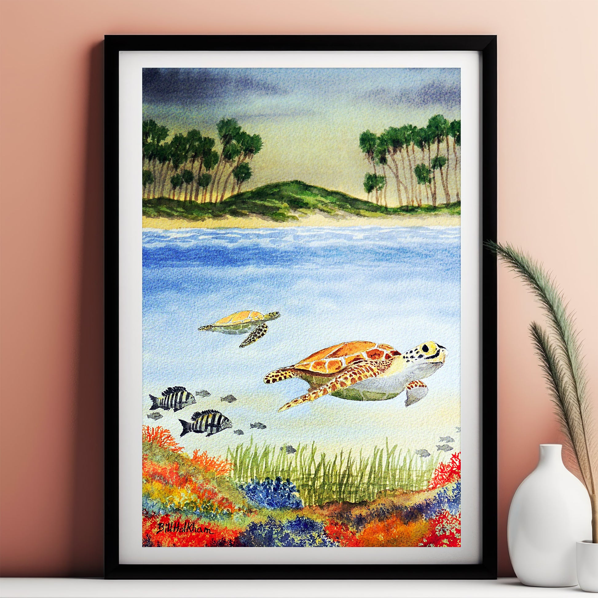 Sea turtles glide effortlessly through the vibrant, colorful corals of Hawaii, where the ocean feels more like a dream than reality. It’s a place where the water pulses with life, and every glide of the turtle’s flipper is a slow dance with the rhythm of the sea. This watercolor art print captures that raw, unhurried beauty of Hawaii’s underwater world—a peaceful reminder of the untamed wonders just beneath the surface.